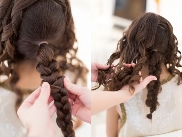 - Сделайте на них косой или прямой пробор и заплетите две косички (с прихватом прядок). При плетении пряди немного вытягивайте, чтобы они выглядели объемно.