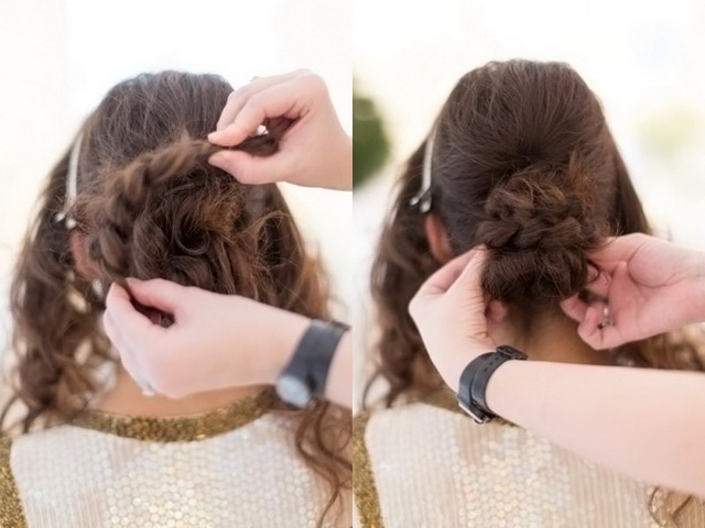 - Теперь, когда пряди ниспадают из-под жгута, подкрутите их валиком, спрятав кончики вовнутрь и зафиксировав их шпильками.