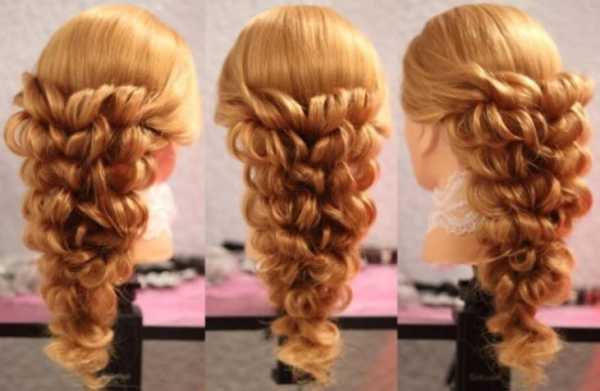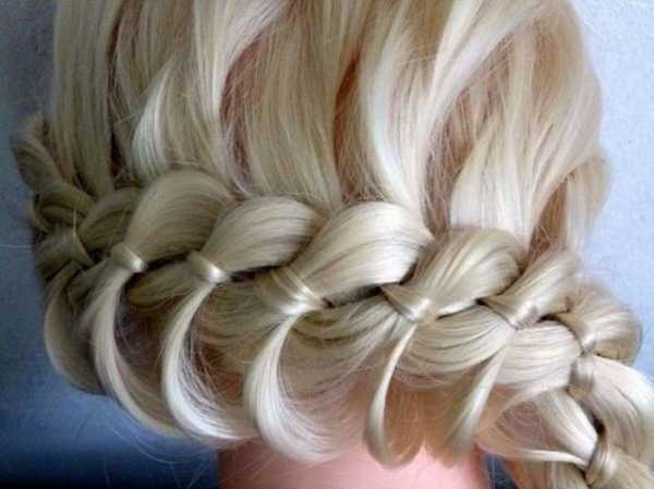 - Подхватываем третью прядь, накручиваем ее и скрещиваем со второй. В таком режиме скручиваем волосы до затылка, после чего фиксируем резинкой.