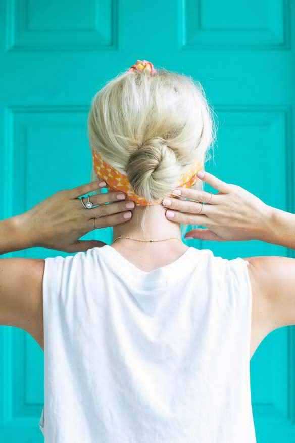 - Формируем ленту из косынки или шарфа. Укладываем вдоль ушей, стараемся не закрыть узел на затылке.