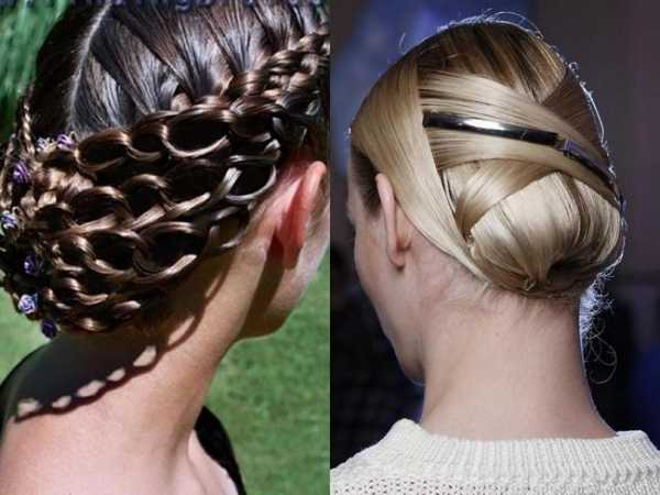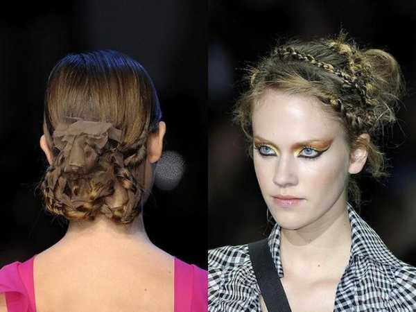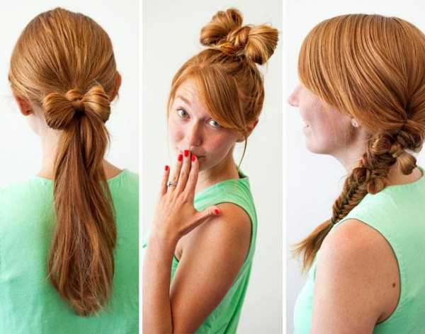Волосы, собранные в пучки и косы, хвосты и плетения