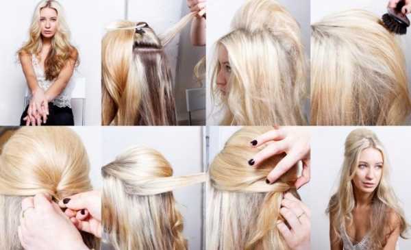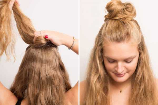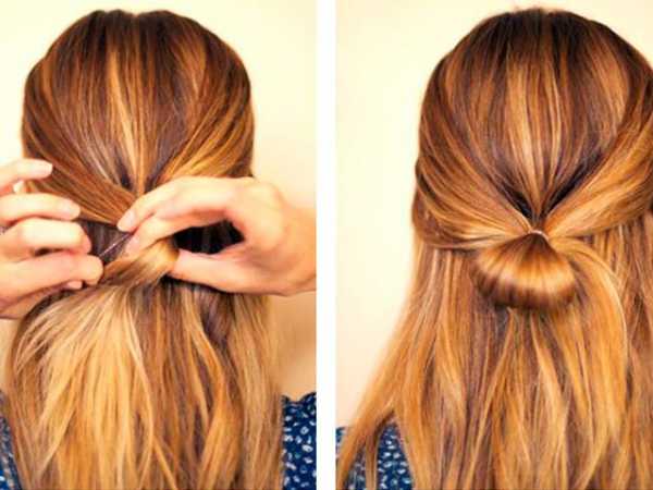 - Готовый начес сверните в жгут и уложите в шишечку, подобрав боковые прядки. Или можете просто закрепить его невидимками. Нижняя часть волос при этом остается распущенной.