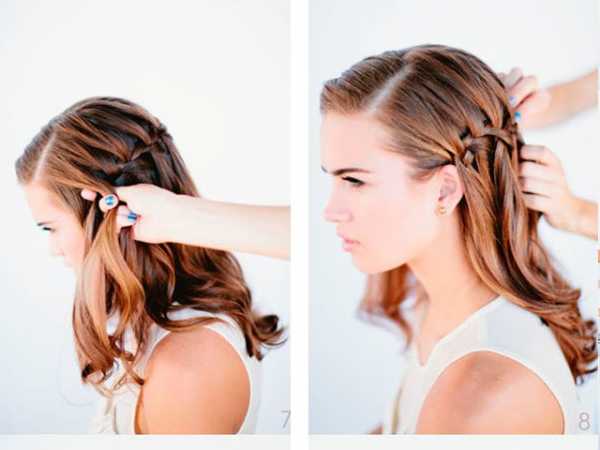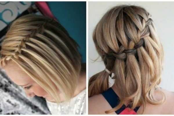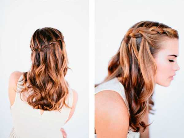 Средние волосы замечательно смотрятся с косой водопад. Такая прическа выглядит изящно и элегантно. То, что нужно для романтичного образа.