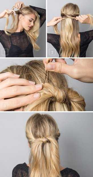 - Альтернативный вариант – сформировать из хвоста жгут или косу и скрутить из них гульку в области макушки.