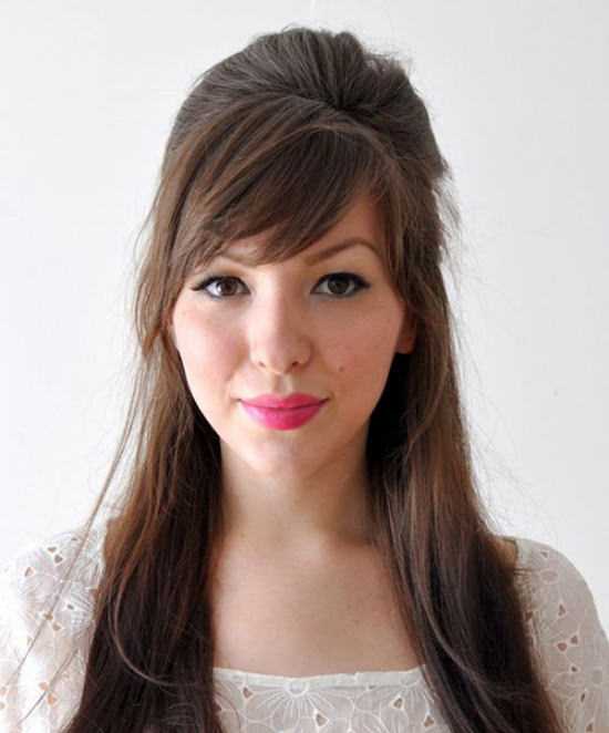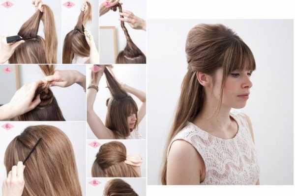 Длинные волосы с французской челкой изящно смотрятся в такой прическе. Это замечательный вариант и для будней, и для праздничных событий.