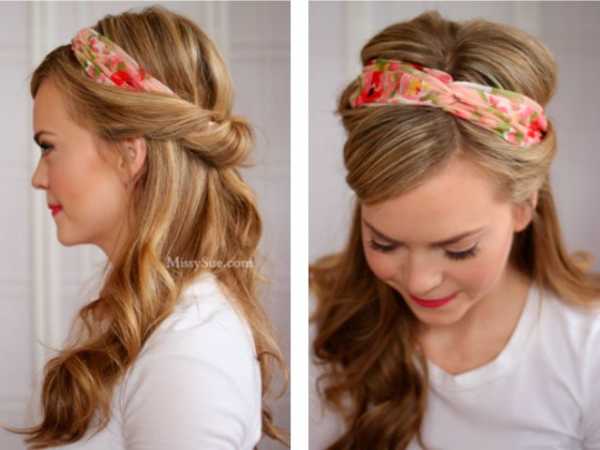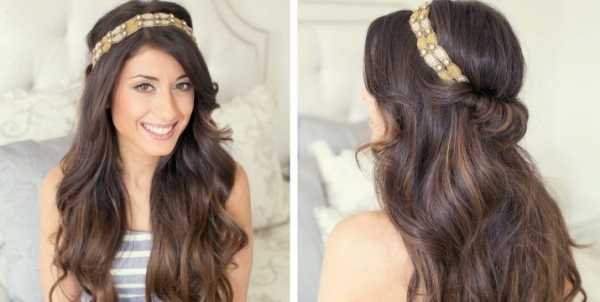 - Сделайте мягкий начес на макушке, оденьте декоративный ободок на голову.