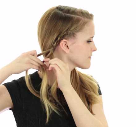 - В правой части выделите среднюю прядь от виска и разделите ее на 3 равных локона.