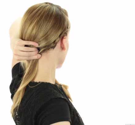 - Плетите косу, а в крайнюю прядку добавляйте прядь с верхней части головы.