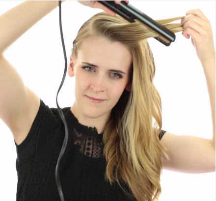- Челку и обрамляющие прядки оформите с помощью плойки и зачешите набок.