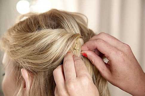 - Макушечную часть волос начешите, плавно уложите назад и хорошо зафиксируйте красивой заколкой, бантом или брошью. Если в образе предусмотрено надевать диадему, начес заколите невидимками.