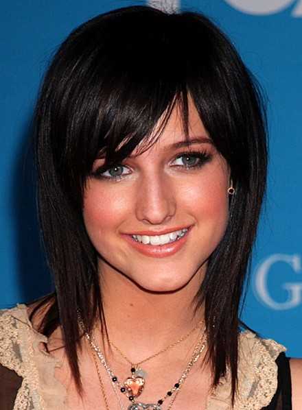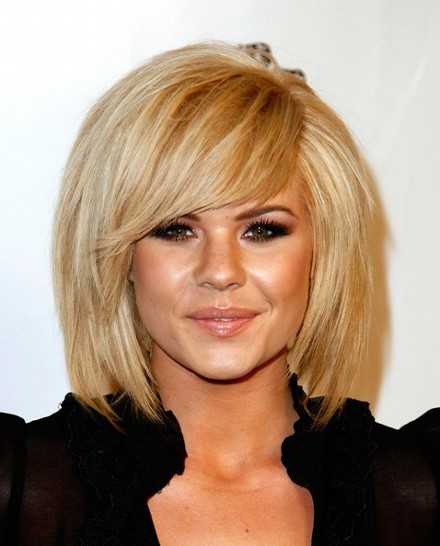 Удлиненная челка на бок или на две стороны удлиняет лицо, скрывает асимметрию. Смотрится на круглом лице. Из стрижек ей подходит легкий каскад либо слоистые варианты, которые выполняют на густых или тонких волосах для создания эффекта объема и легкой небрежности.