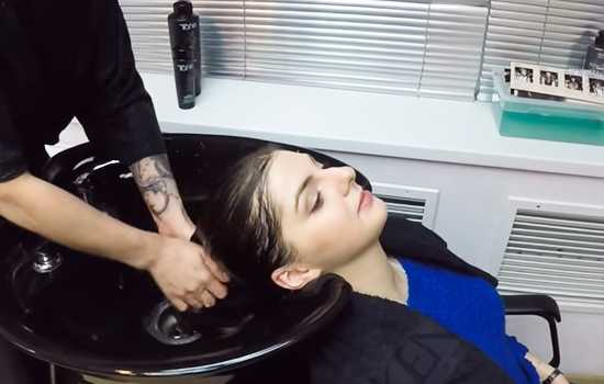- Мастер моет волосы с применением шампуня глубокого очищения.